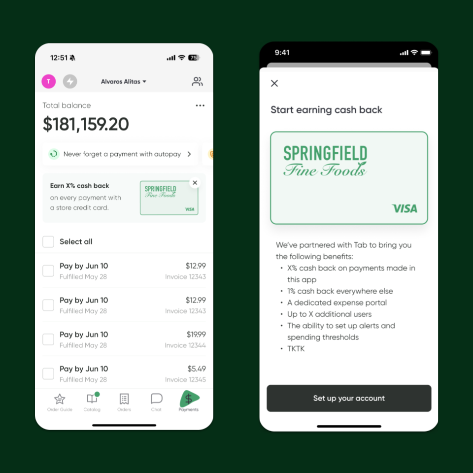 Pepper integrates Tab’s branded card programs directly into the distributor workflow, allowing distributors to present the card as a preferred way for restaurants to pay and manage spend. Because the cards run on existing card networks, Pepper can leverage current payment infrastructure without major changes.